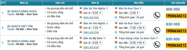 Đường đi Kon Tum hiện nay rất thuận tiện, nhiều xe chất lượng cao và có nhiều lựa chọn dành cho du khách muốn đi Kon Tum hoặc cần gửi đồ, nhận đồ đi (từ) Kon Tum. Cùng tham khảo danh sách các nhà xe sau đây và gọi ngay Tổng đài : 1900 636 212 để đón xe khách Hà Nội đi Kon Tum nhanh chóng và an toàn nhất.